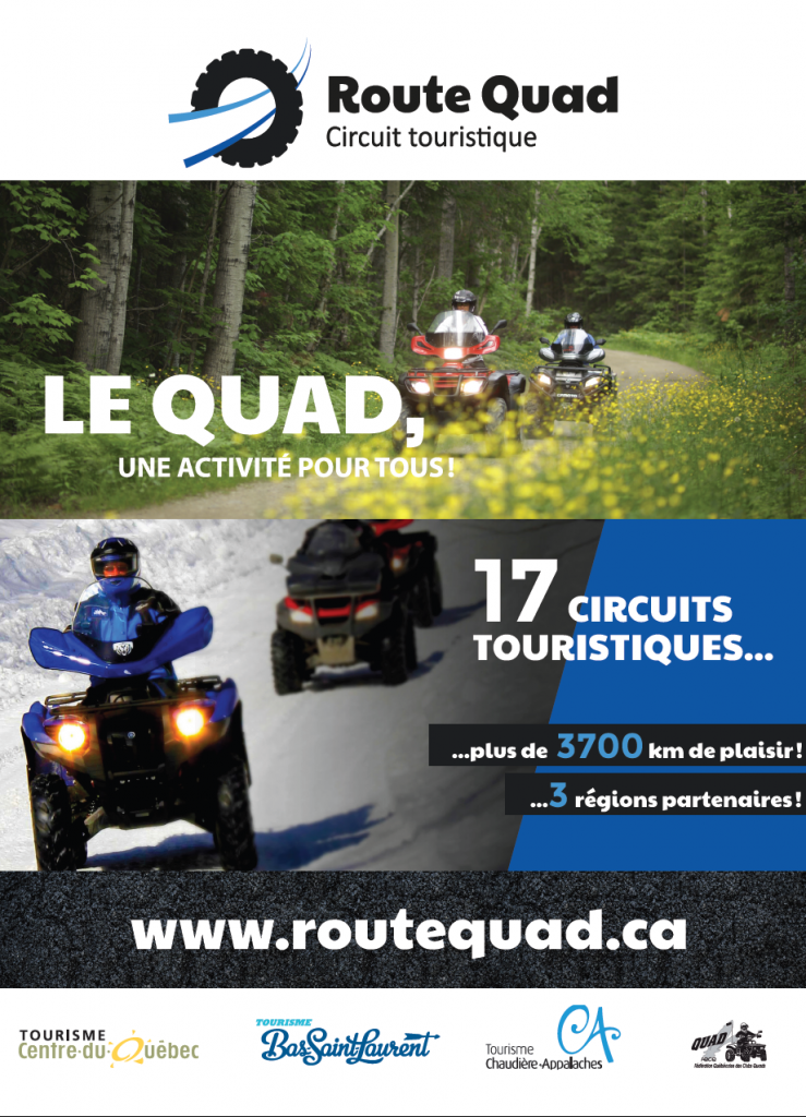La Route Quad : La FQCQ et trois ATR lancent les premiers circuits touristiques quads Saint-Hyacinthe, le 14 novembre 2014 – La Fédération Québécoise des Clubs Quad (FQCQ) est heureuse de s’associer avec trois Associations touristiques régionales (ATR) soit celles du…
